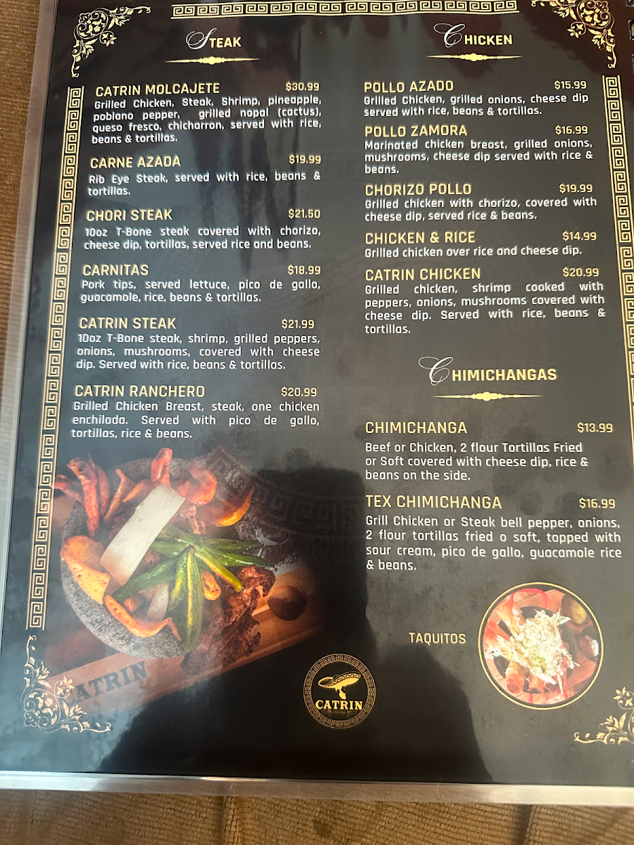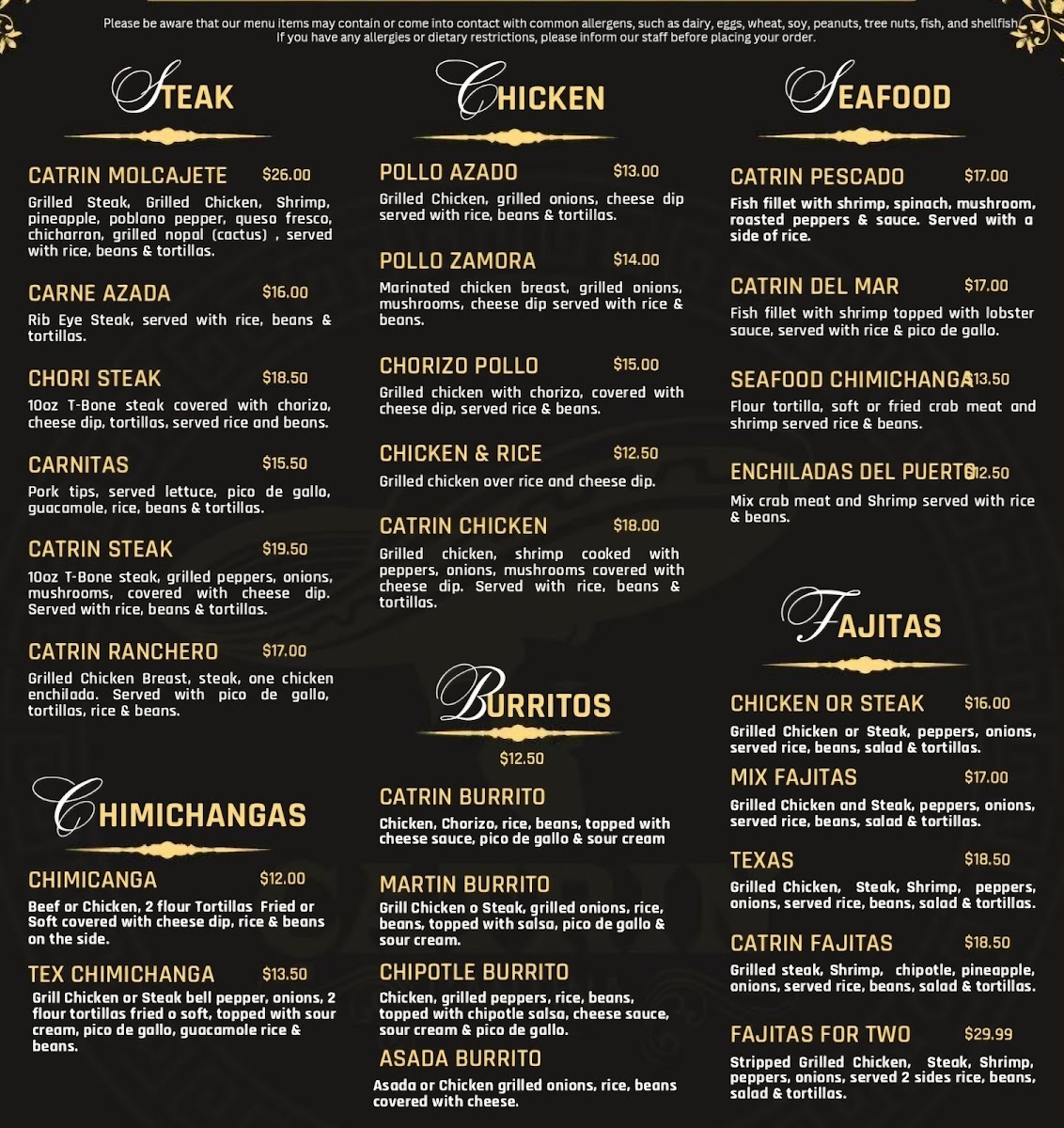 Grill Chicken or Steak bell pepper, onions, 2 flour tortillas fried o soft, topped with sour cream, pico de gallo, guacamole rice & beans.